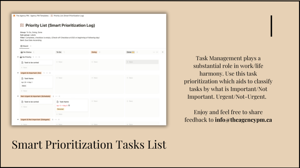 Have you heard of the Eisenhower Matrix? It's a method of task prioritization by classifying tasks by what is Important/Not Important. Urgent/Not-Urgent. In this template, I've built a Task Log that will prioritize tasks for you.